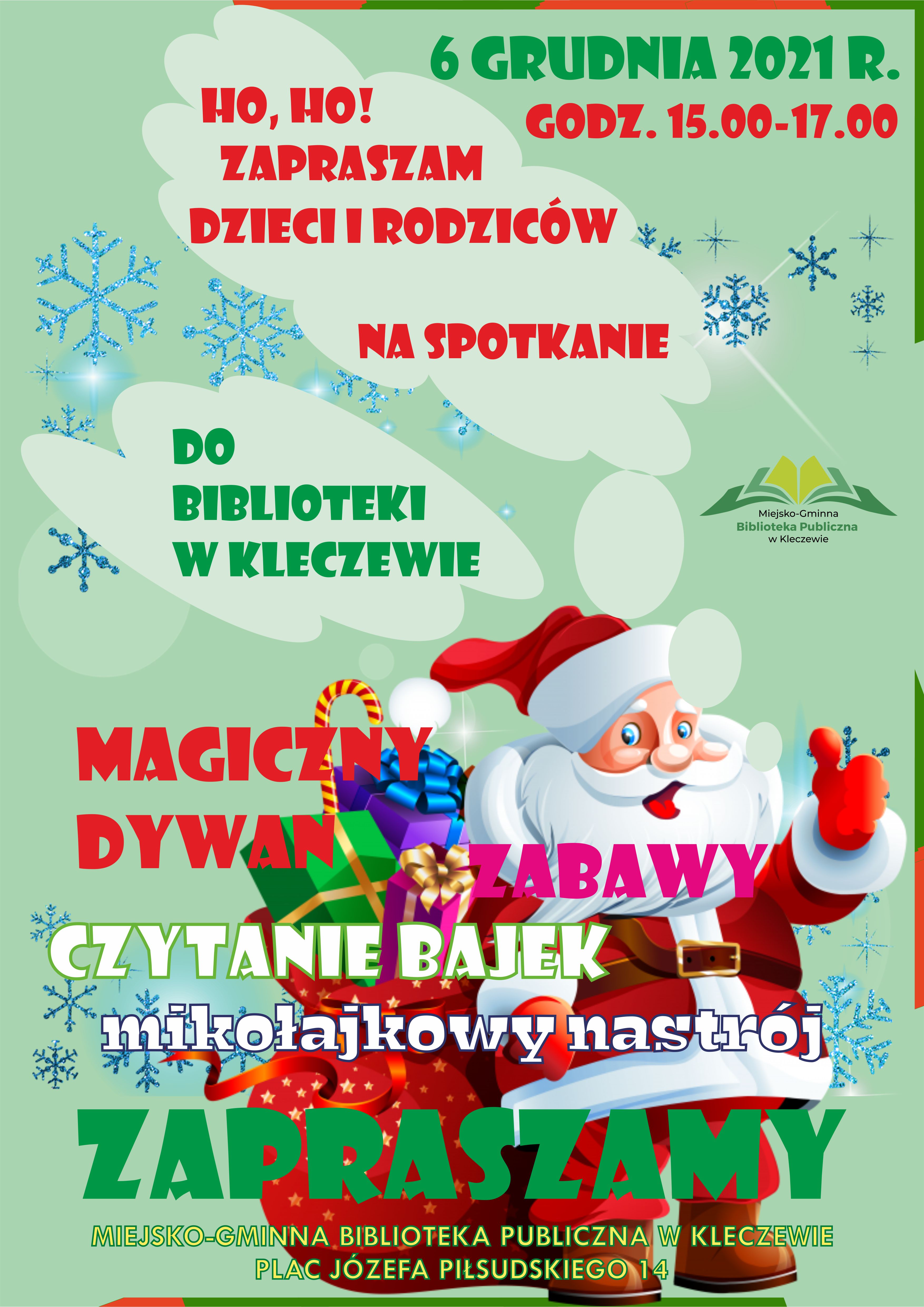 Już w poniedziałek naszą bibliotekę odwiedzi św. Mikołaj. Na spotkanie z nim zapraszamy dzieci wraz z rodzicami w godz. 15.00-17.00.